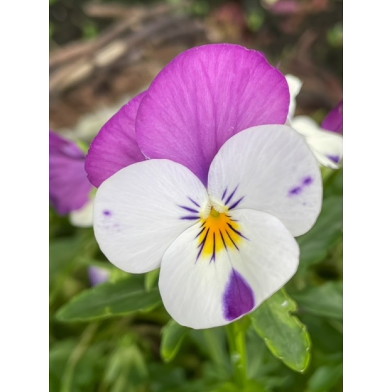 Beautiful smiling face peaking out in winter sunshine. Delicate veins showing on the face of this viola